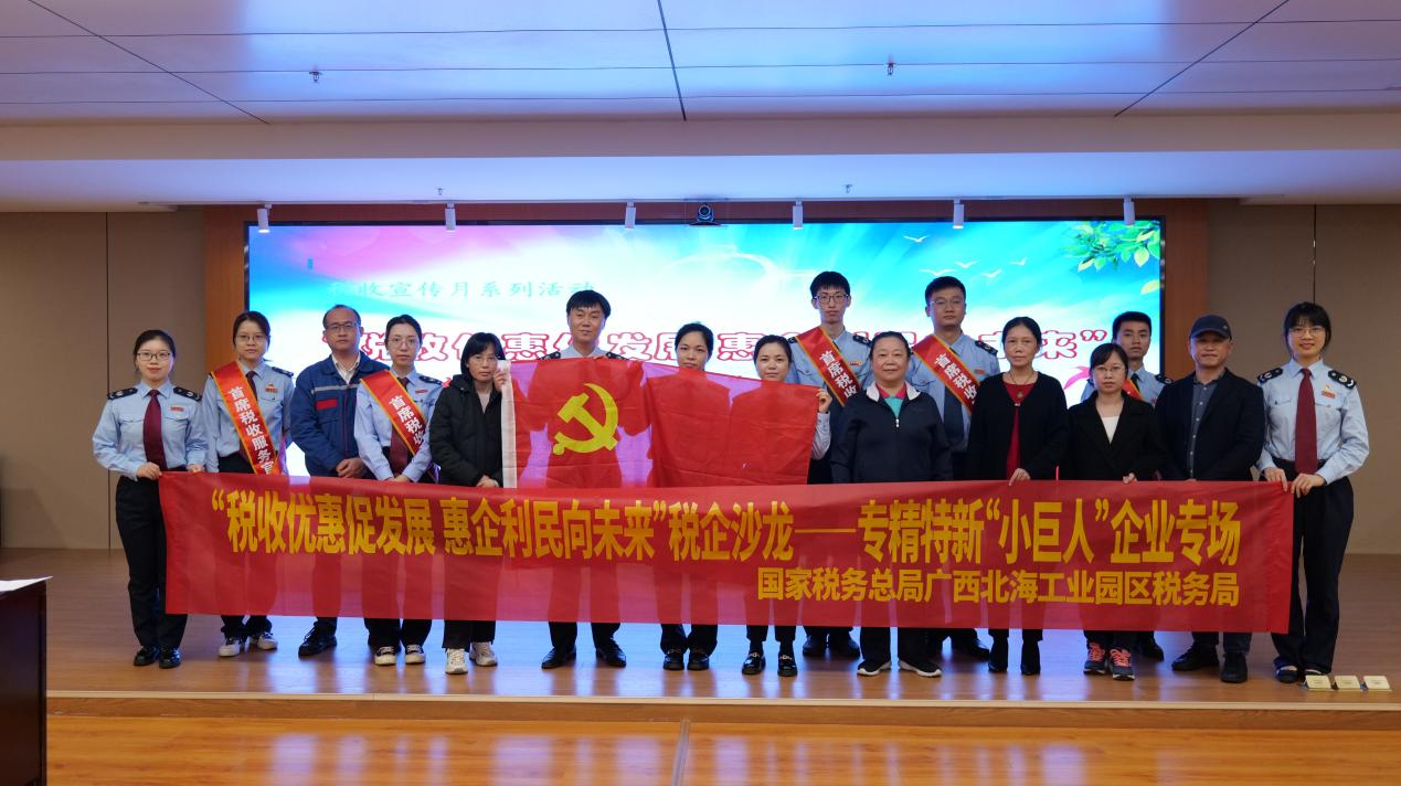 正值第31个全国税收宣传月,广西北海工业园区税务局以“税收优惠促发展 惠企利民向未来”为主题开展税收宣传月系列活动,4月18日下午,开展专精特新“小巨人”企业专场沙龙,主要内容是做好组合式税费支持政策的宣传辅导,帮助解决企业在政策落实中遇到的难点堵点问题,进一步密切税企沟通。活动邀请到了广西北海玉柴马石油高级润滑油有限公司等5家专精特新“小巨人”企业参加。
