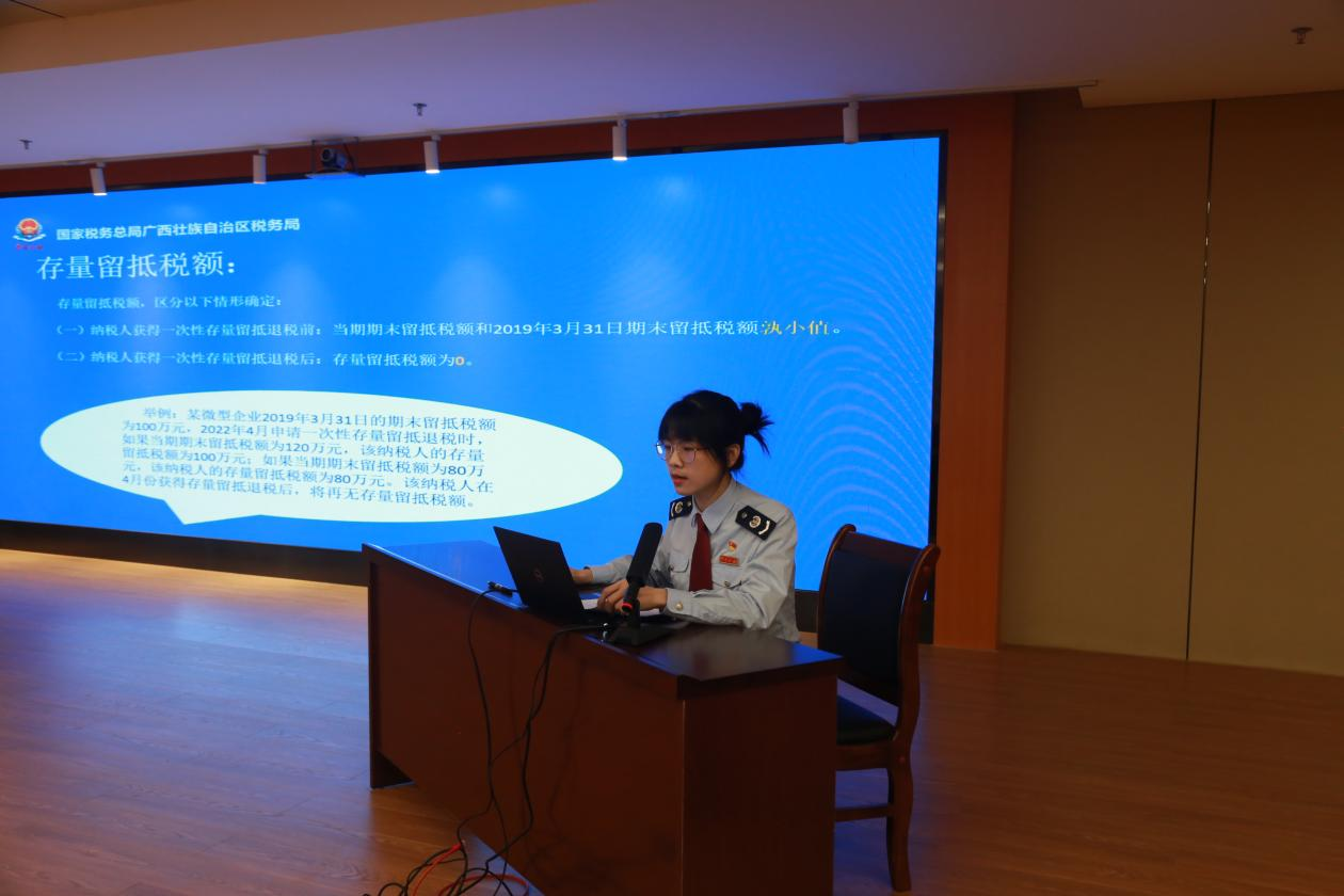 “税务小蓝”党员先锋队队员陈芳仔细讲解了组合式税费支持政策,并针对5家企业的特点分别讲了其在增值税留抵退税中需要注意的难点。