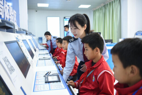 平南县大鹏镇龙街小学的同学变身为“税务体验师”,进入办税一线“零距离”体验和感受税收。 曹增梅 摄