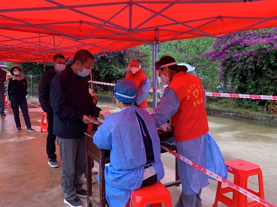 11月30日,阳朔县税务局迅速响应县委县政府的疫情防控紧急部署,第一时间号召全局党员干部积极报名参加志愿服务,成立“党员志愿服务小队”“青年模范志愿服务小队”。16名党员干部分为两队志愿服务小队,身穿志愿服务红马甲,前往阳朔县神山村口核酸检测点参与核酸检测点志愿服务工作。阳朔县税务干部志愿者任劳任怨,奋斗在疫情防控一线。“税务蓝”和“志愿红”为筑牢阻击疫情的防线做出默默奉献,守护阳朔千家万户的寻常烟火。