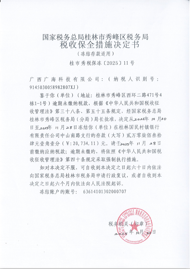 【秀峰区】国家税务总局桂林市秀峰区税务局关于送达《税收保全措施决定书》的公告(广西广海科技有限责任公司)