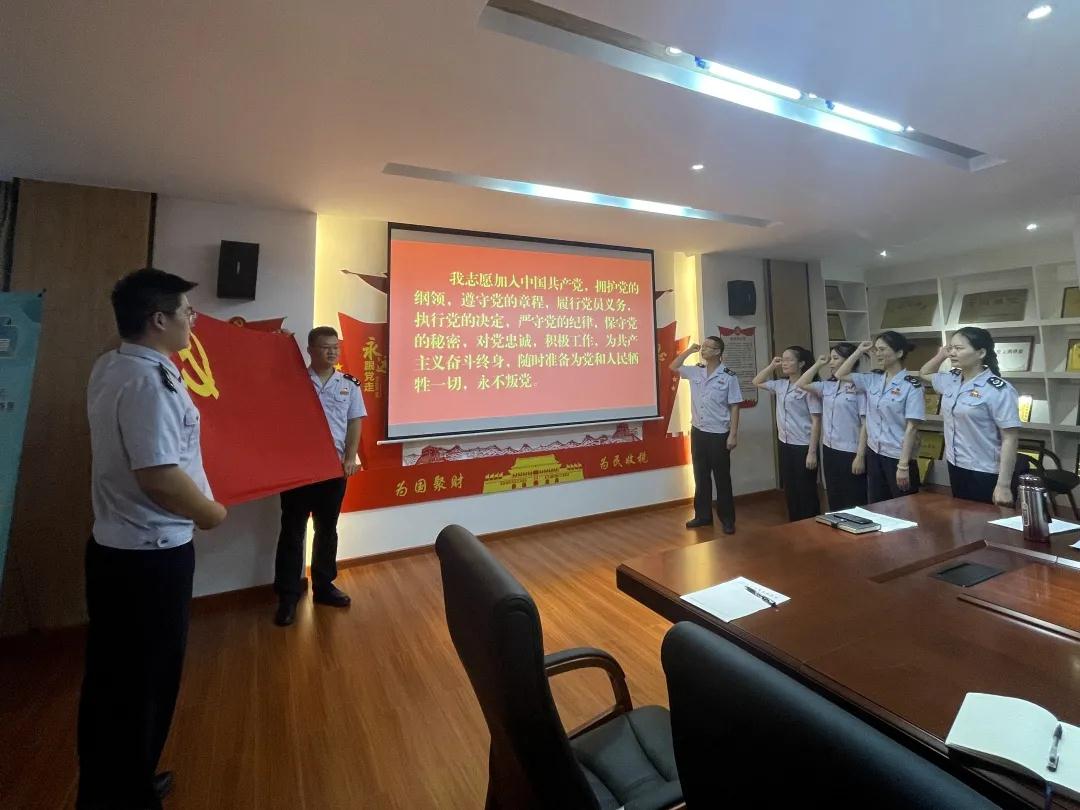忻城县税务局第一税务分局党支部、城关税务分局党支部联合开展“传承红色精神 感悟初心使命 践三新促发展”主题党日活动。4名新入党同志和老党员一同举起右拳,向着鲜红的党旗郑重宣誓,将不忘初心、牢记使命、勇于担当作为融入到铮铮誓言之中。
