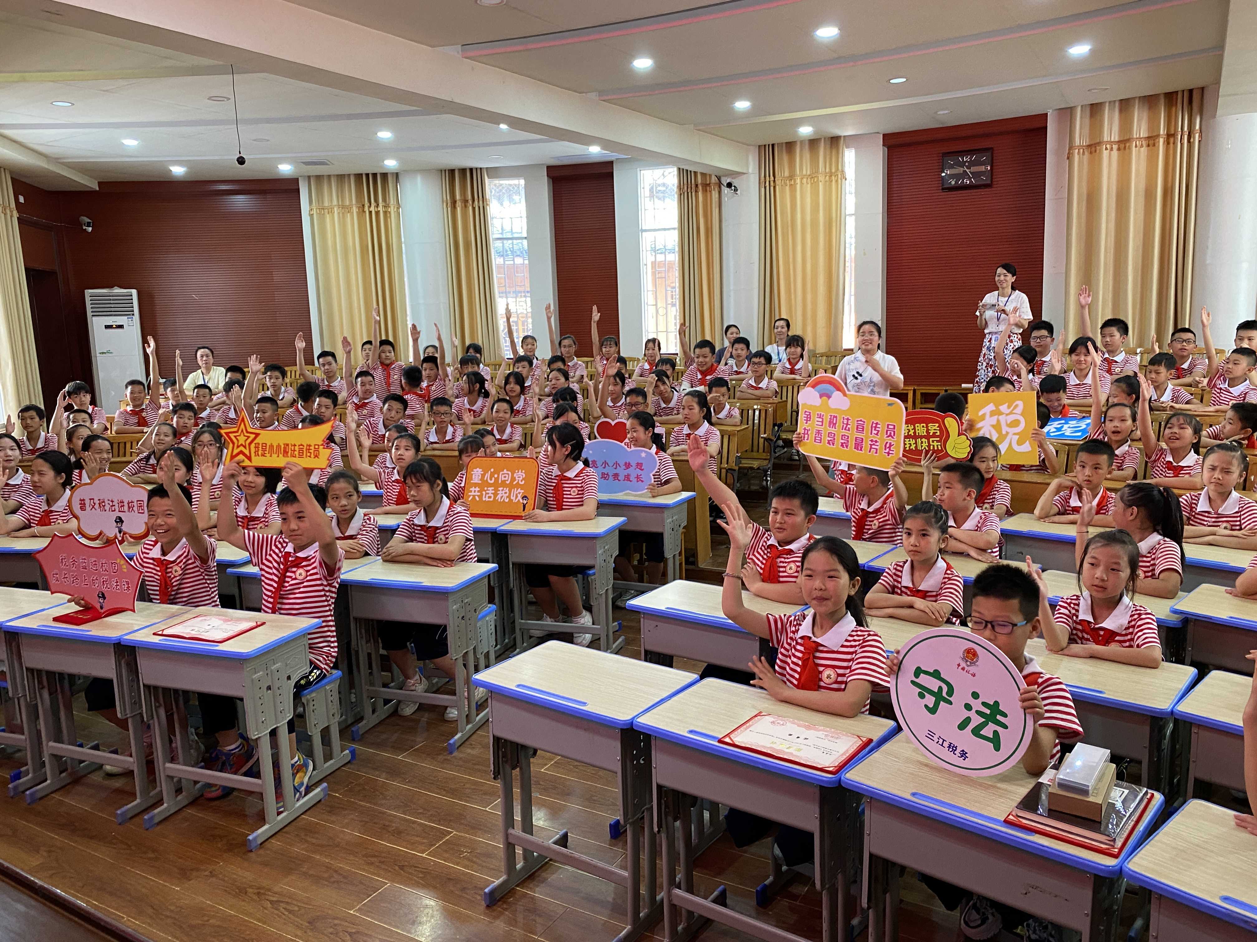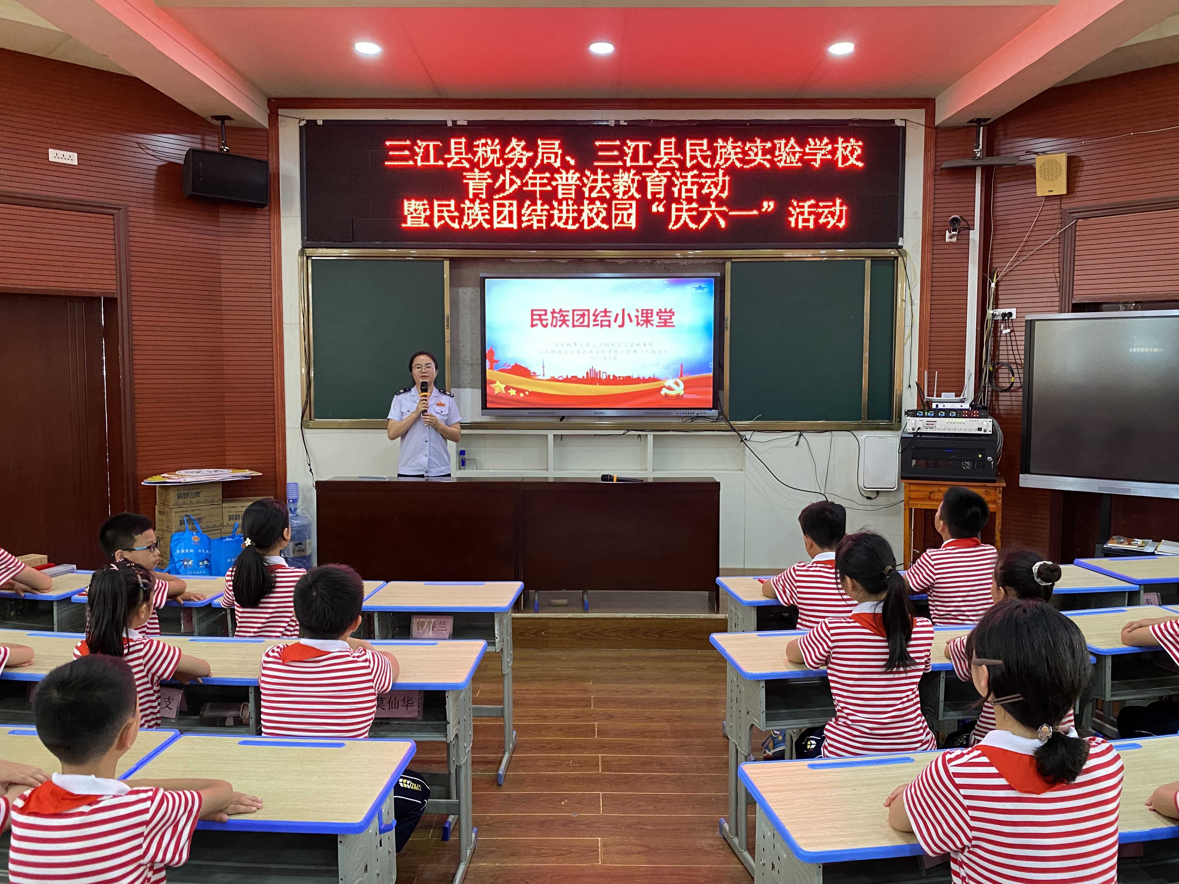为进一步强化青少年税收普法教育,推动税法宣传进校园常态化建设,深化民族团结进步教育,铸牢中华民族共同体意识。2023年5月31日,在第73个国际“六一”儿童节即将来临之际,三江侗族自治县税务局与三江侗族自治县民族实验学校小学部北校区联合开展“税月伴成长 童心向未来”青少年普法教育暨民族团结进校园“庆六一”活动,共同为青少年讲解税法小知识、中华优秀传统文化故事、民族风俗,将税收法治宣传与民族团结教育融合推进,让青少年走近税收,了解民族传统知识,认识民族团结的意义。