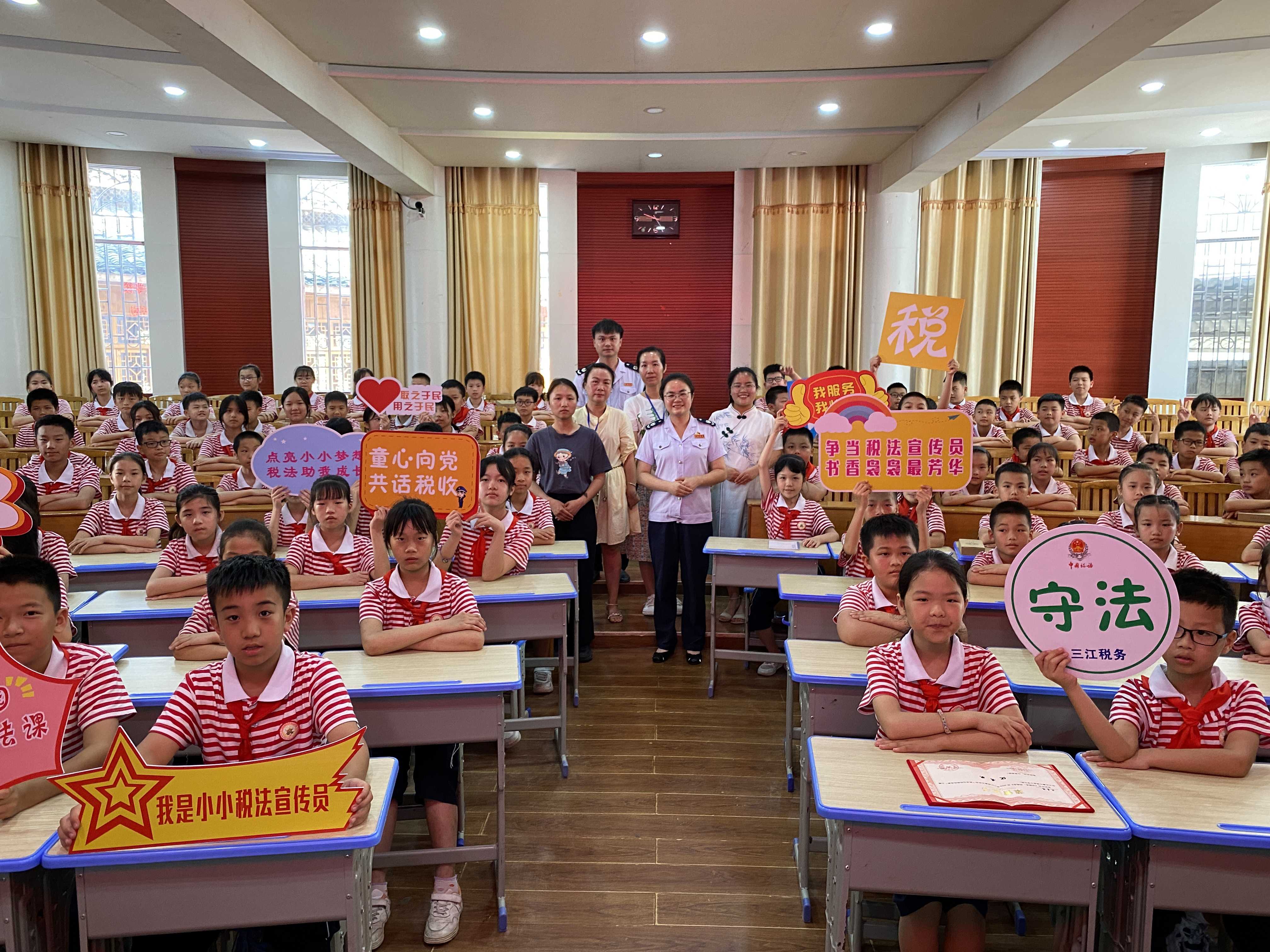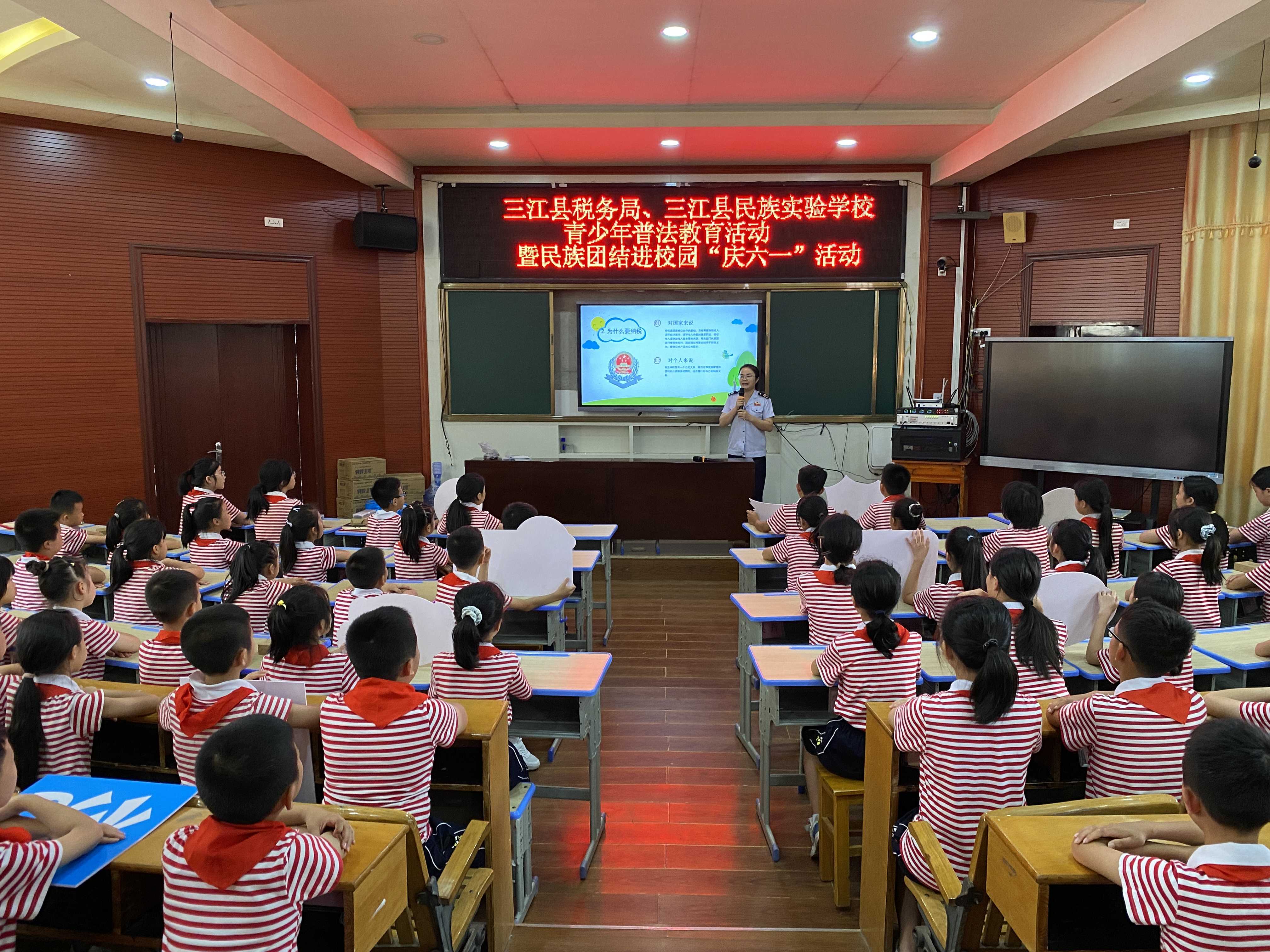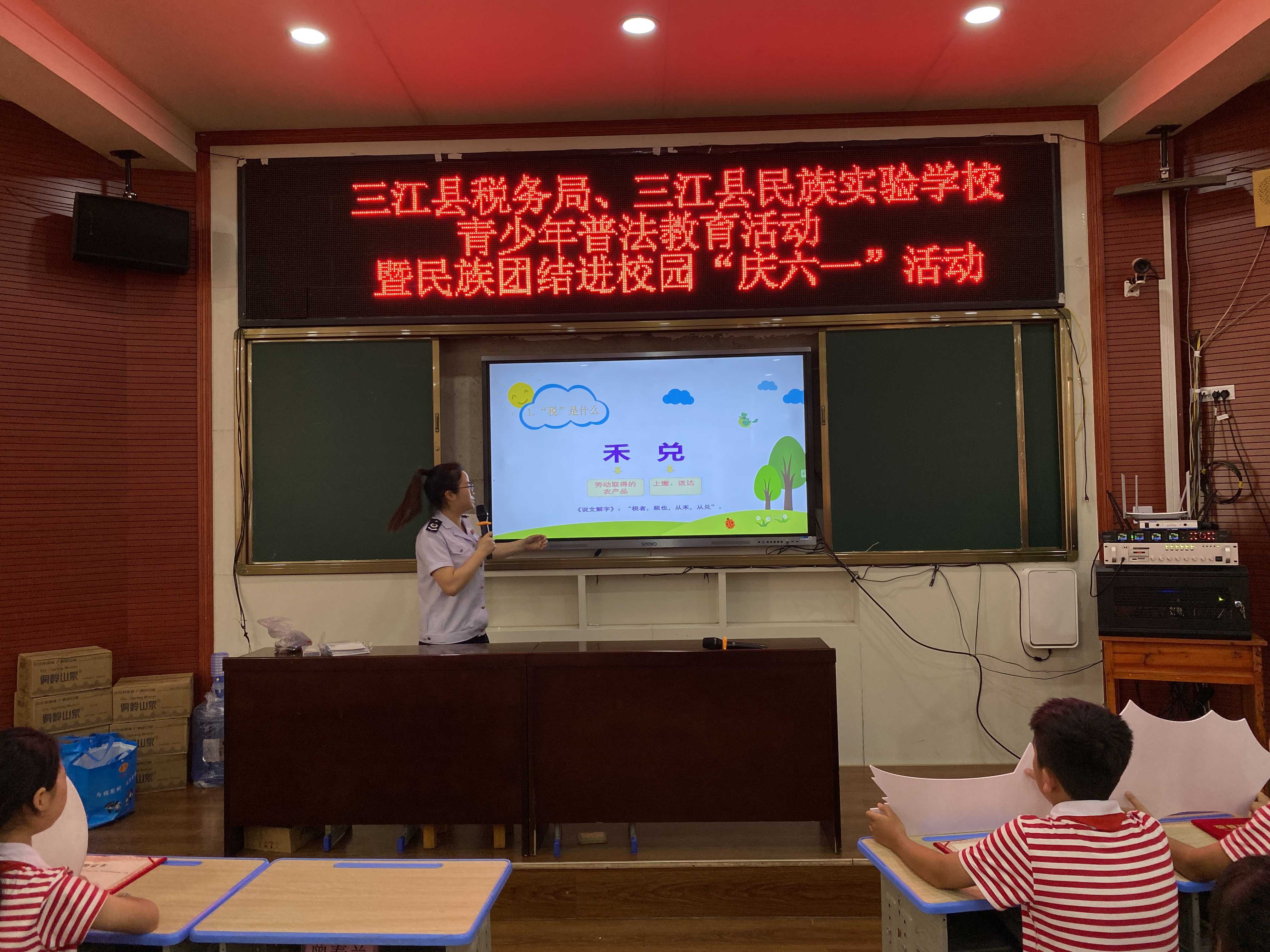 “同学们,你们知道‘税’字为什么是由一个‘禾’字和一个‘兑’字组成的吗?”“税收都用在哪里?”“我国有多少个少数民族呢?”三江侗族自治县税务局工作人员化身“税法小老师”,通过以孩子们喜闻乐见、通俗易懂、互问互答的方式,对青少年法律法规、民族团结进步等相关知识进行专题解读,进一步加深了孩子们对法律法规和民族团结知识的认识和理解。