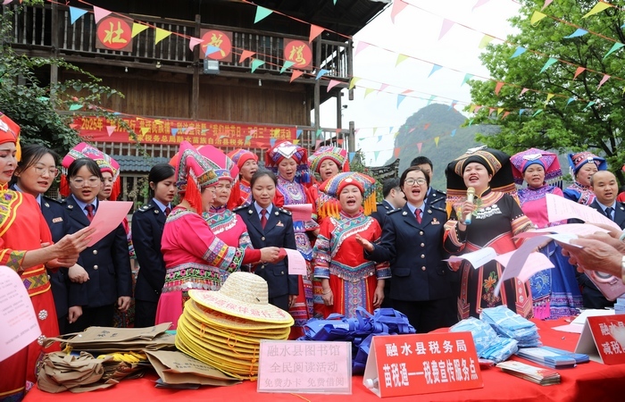 随着广西“三月三”民歌节和第34个全国税收宣传月的到来,广西柳州融水苗族自治县税务局积极行动,组织税务青年“苗税通”税费服务团队,到当地“三月三”民歌节坡会现场,围绕“税收·法治·公平”主题开展了“税月相伴 共唱民族情”税收宣传。借助当地苗族、壮族民俗特色,将最新的税收优惠政策融于通俗易懂的山歌,通过对唱、彩调、渔鼓等传唱的形式,唱出了税费政策的“好声音”,打造第34个全国税收宣传月的新特色。