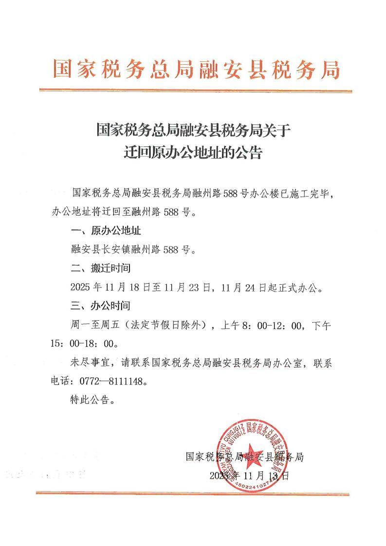国家税务总局融安县税务局融州路588号办公楼已施工完毕,办公地址将迁回至融州路588号。