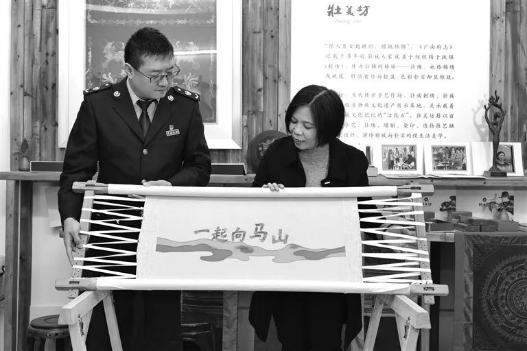 全国人大代表、马山壮美坊壮绣手艺厂技术指导蓝淋向税务人员展示并讲解其设计制作的壮绣作品《一起向马山》通讯员 许钰琦摄