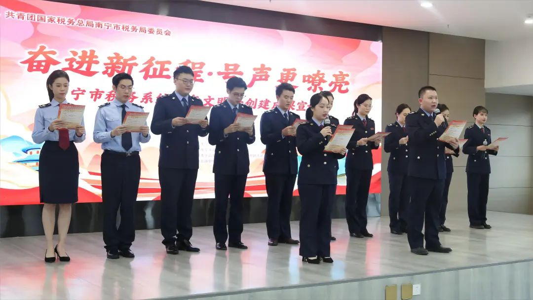 “让我们以青春之名倡议:在深化税收征管改革主战场、在退税减税降费最前沿、在便民办税服务第一线,发挥着青春的光和热......”宣讲会结束之际,南宁市江南区税务局青年干部朱崇滔和韦晶晶带领现场的税务青年向全市各级团组织和广大团员青年发出税务青年服务倡议。挺拔的身姿、洪亮的声音、坚定的眼神,彰显着税务青年砥砺前行、奋力拼搏的决心。青年们纷纷表示,宣讲活动干货满满、收获满满。“我们要向一星级全国青年文明号学习,立足本职岗位加强学习实践,发扬斗争精神奋力攻坚克难,聚焦党和国家事业发展大局所需,纳税人缴费人所盼,税收改革发展所向,用实际行动为税收现代化建设添砖加瓦。”南宁市兴宁区税务局团支部书记栾皓如说道。