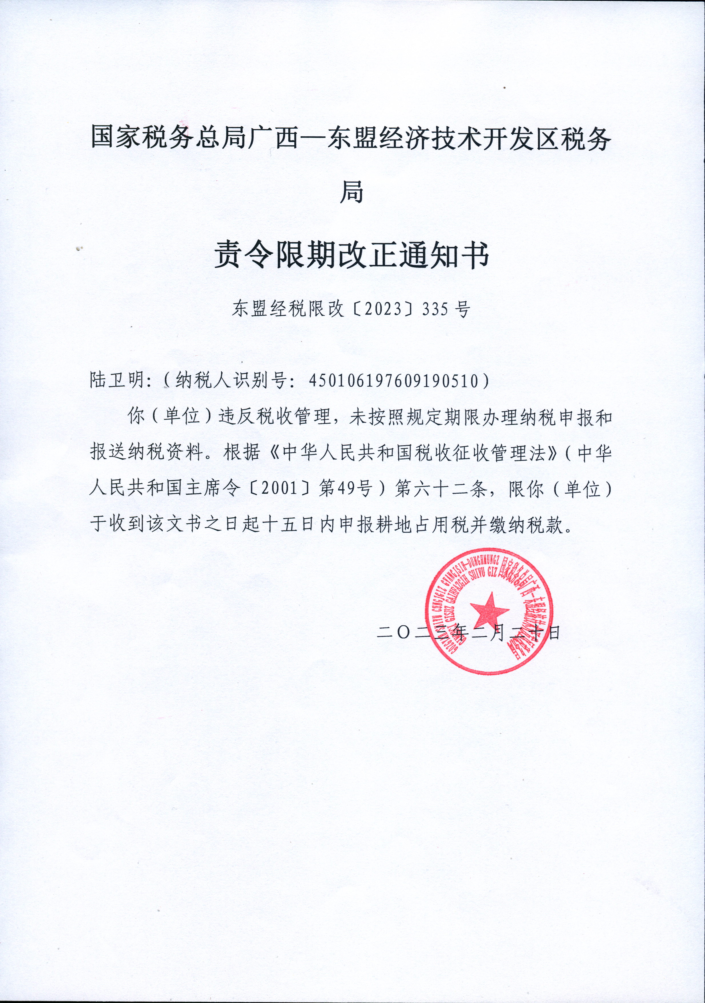 【东盟区】国家税务总局广西—东盟经济技术开发区税务局责令限期改正通知书