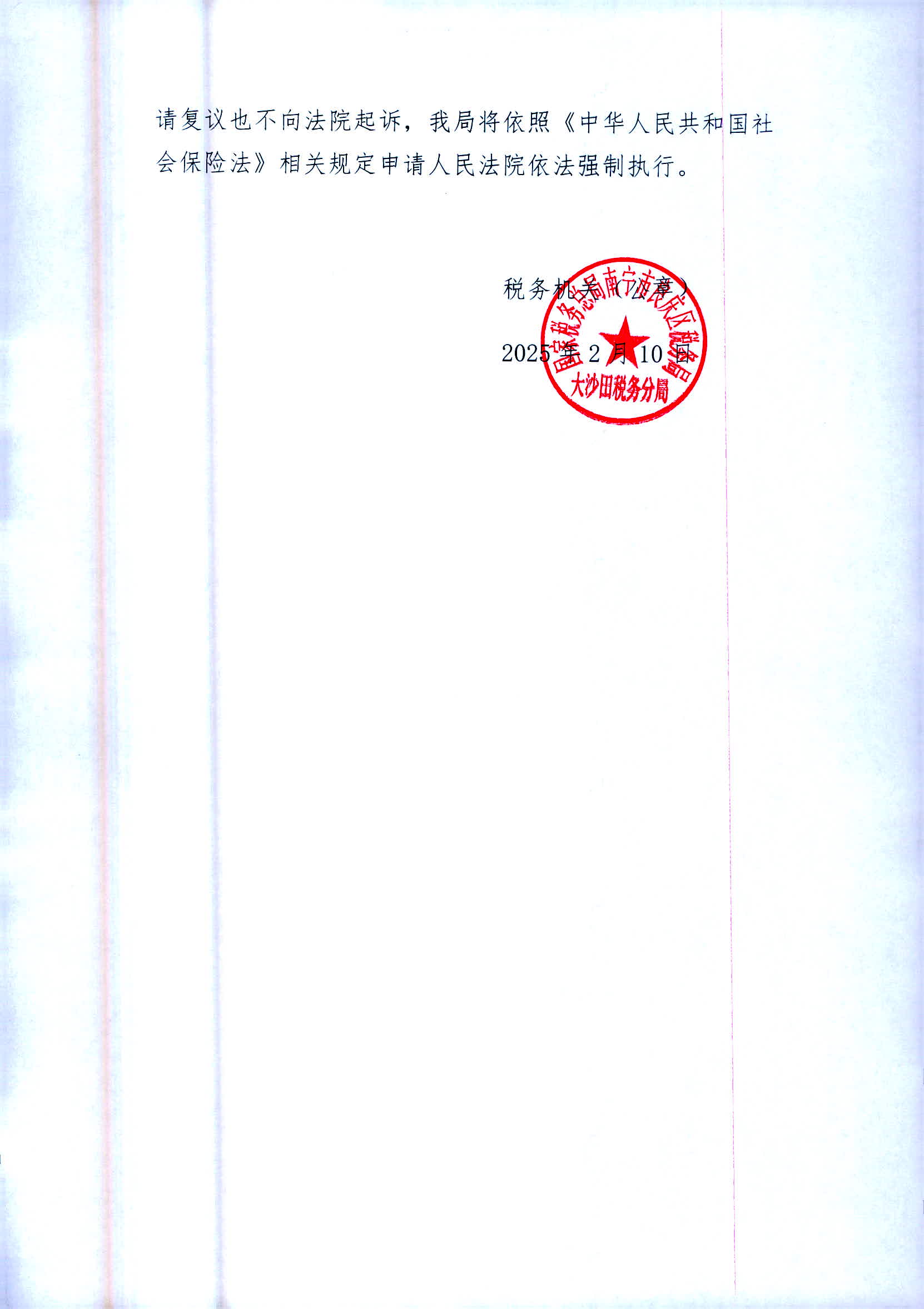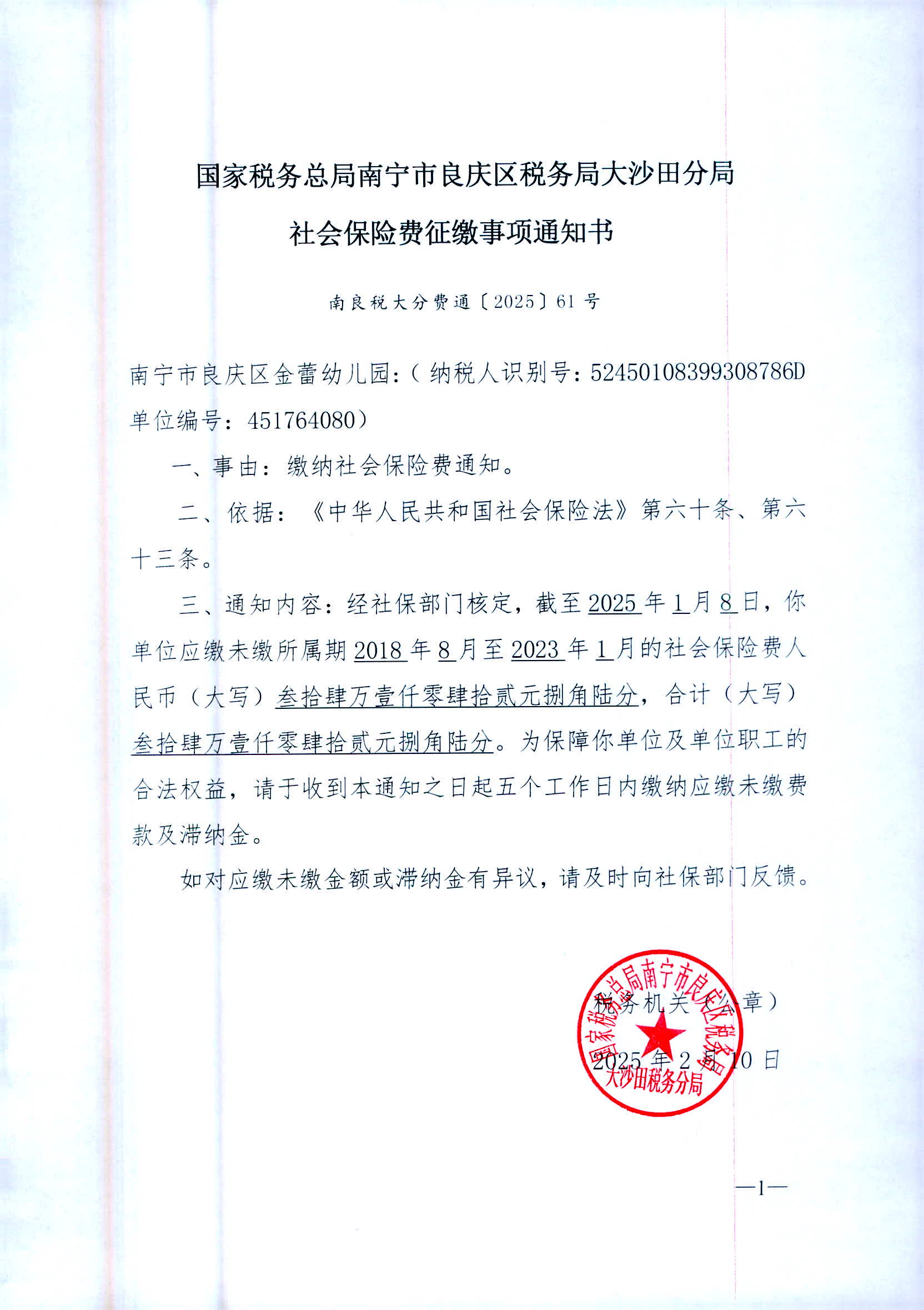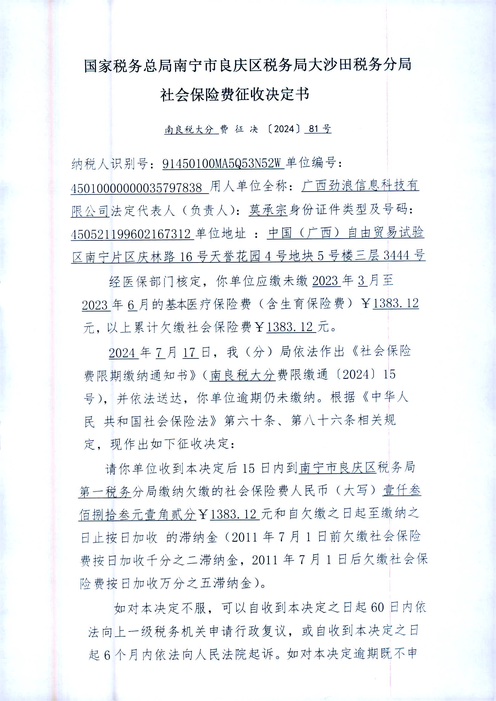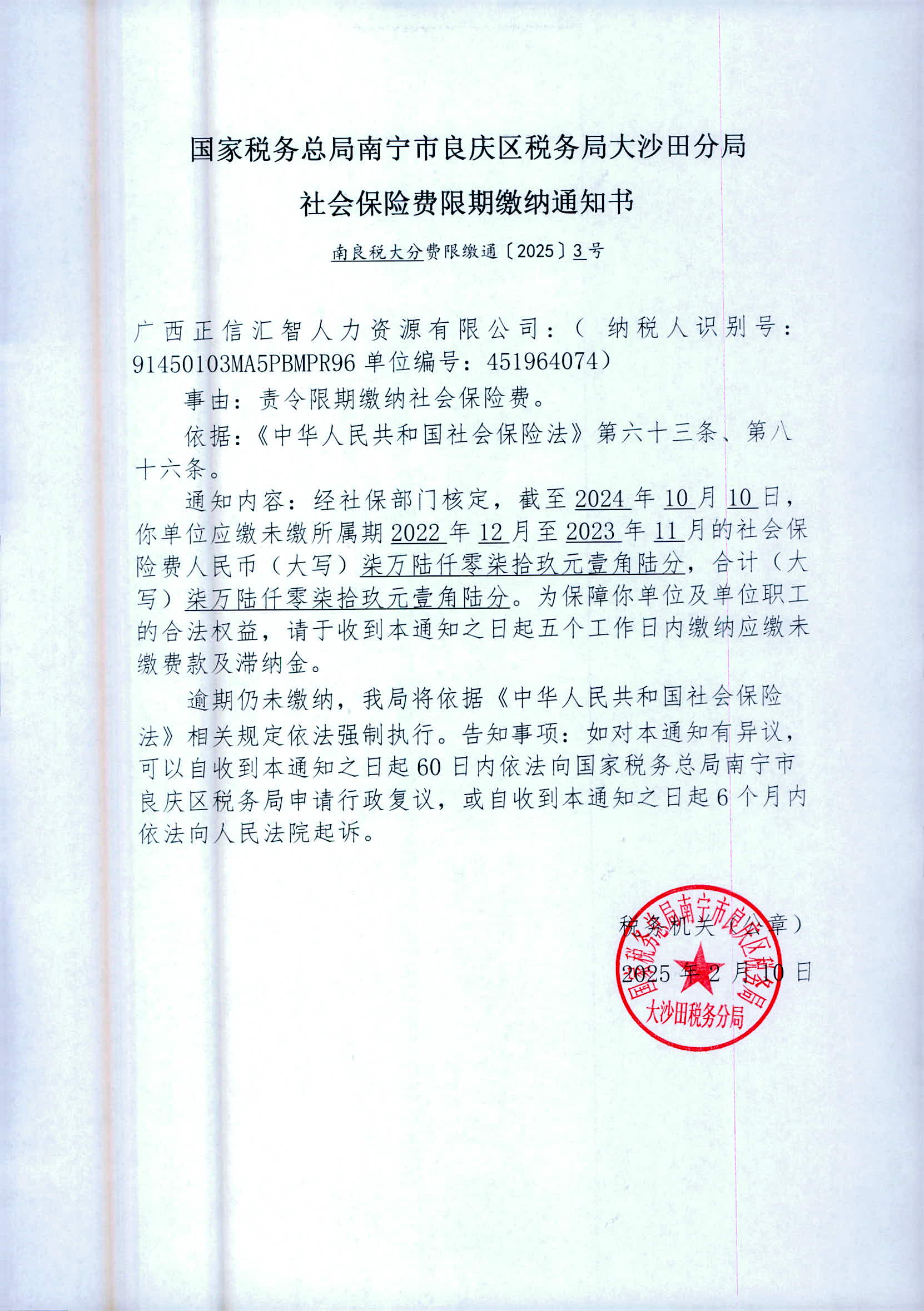 依照《中华人民共和国税收征收管理法实施细则》第一百零六条规定,因采取法律规定的其他送达方式无法送达,现向您公告送达《社会保险费征缴事项通知书》、《社会保险费限期缴纳通知书》、《社会保险费征收决定书》,自公告送达之日起满30日,即视为送达。