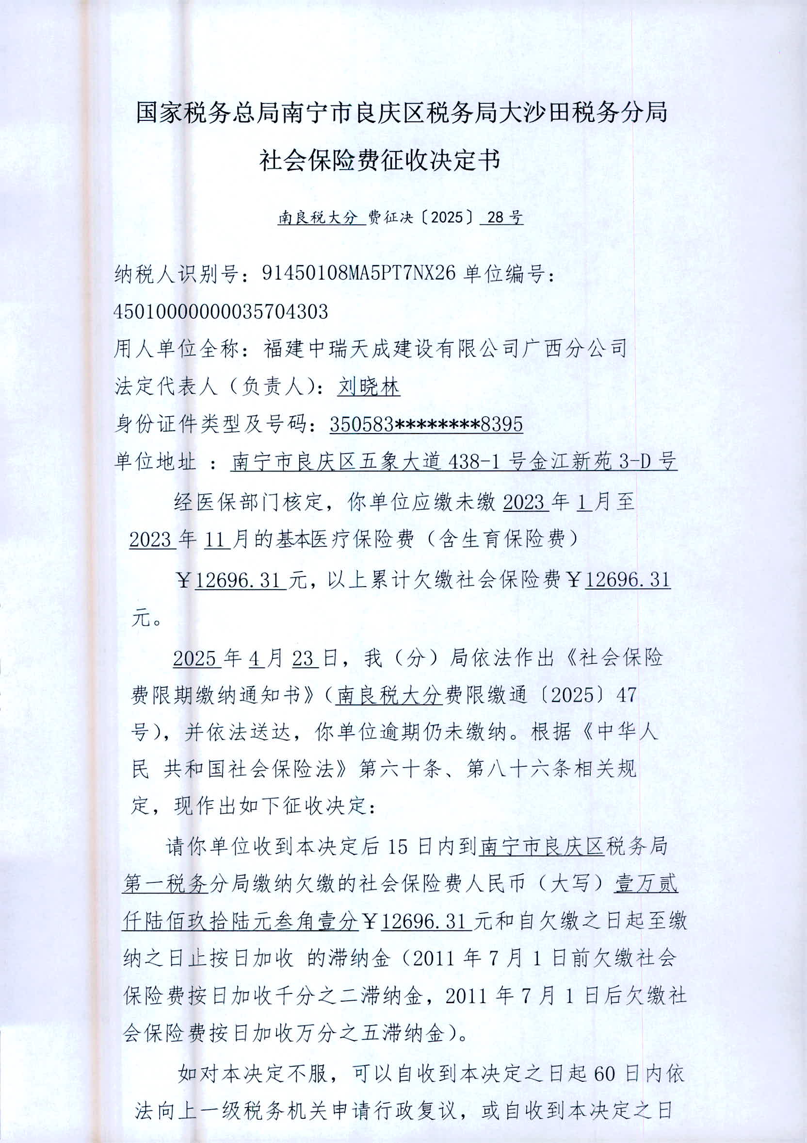 2.《社会保险费征收决定书》南良税大分费征决〔2025〕28号
