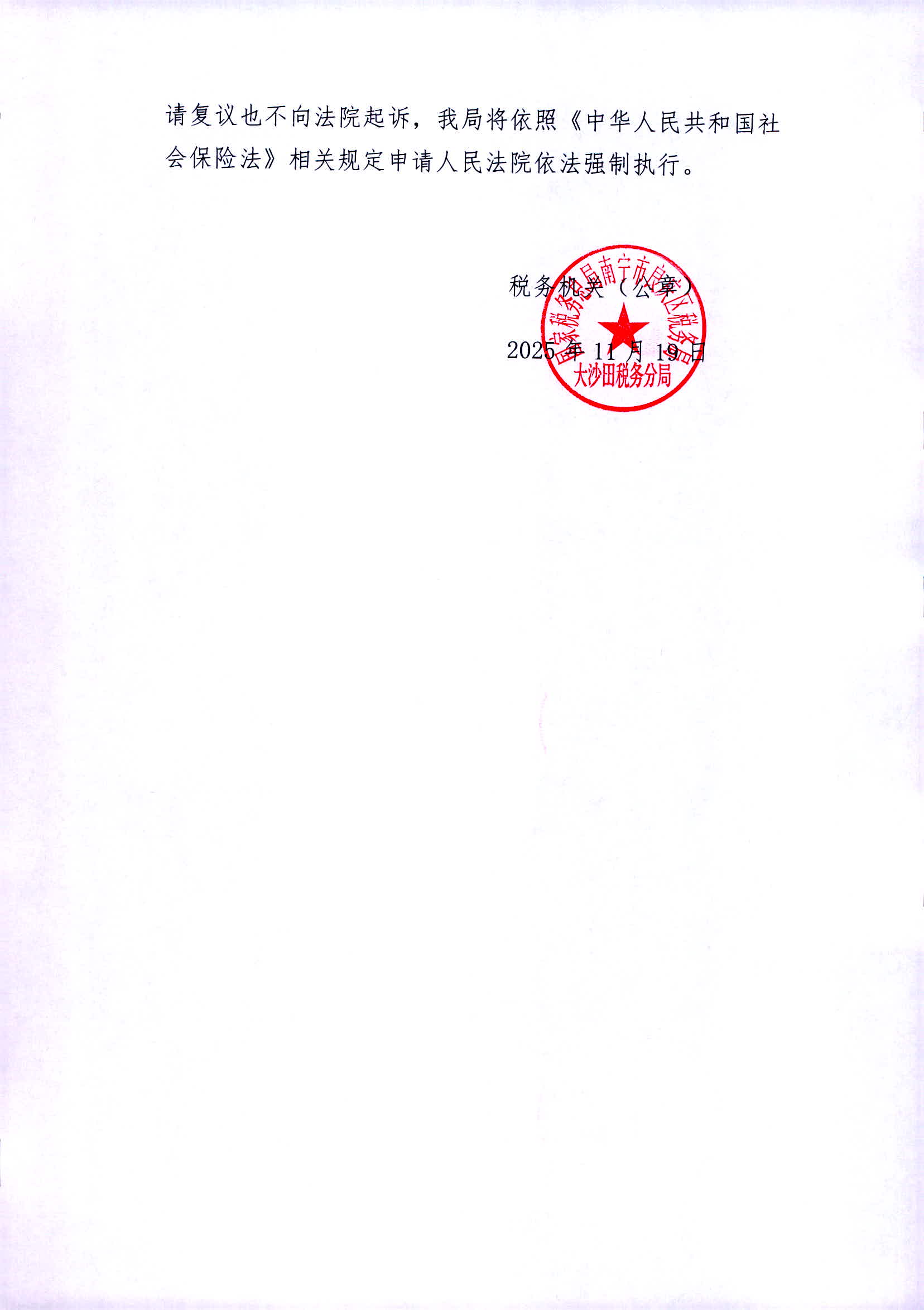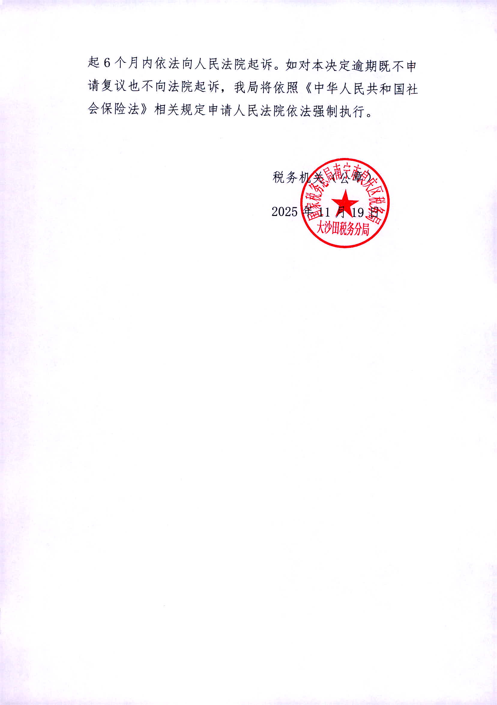 请你公司及时到我局大沙田税务分局签收《社会保险费征收决定书》南良税大分费征决〔2025〕27号、《社会保险费征收决定书》南良税大分费征决〔2025〕28号,本公告自发布之日起满30日,上述《社会保险费征收决定书》即视为送达。