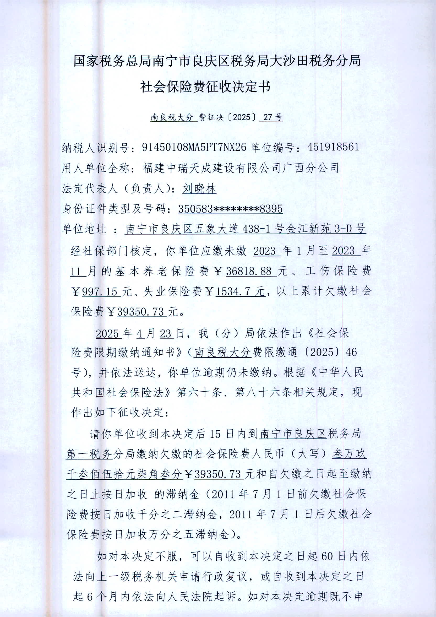 附件:1.《社会保险费征收决定书》南良税大分费征决〔2025〕27号