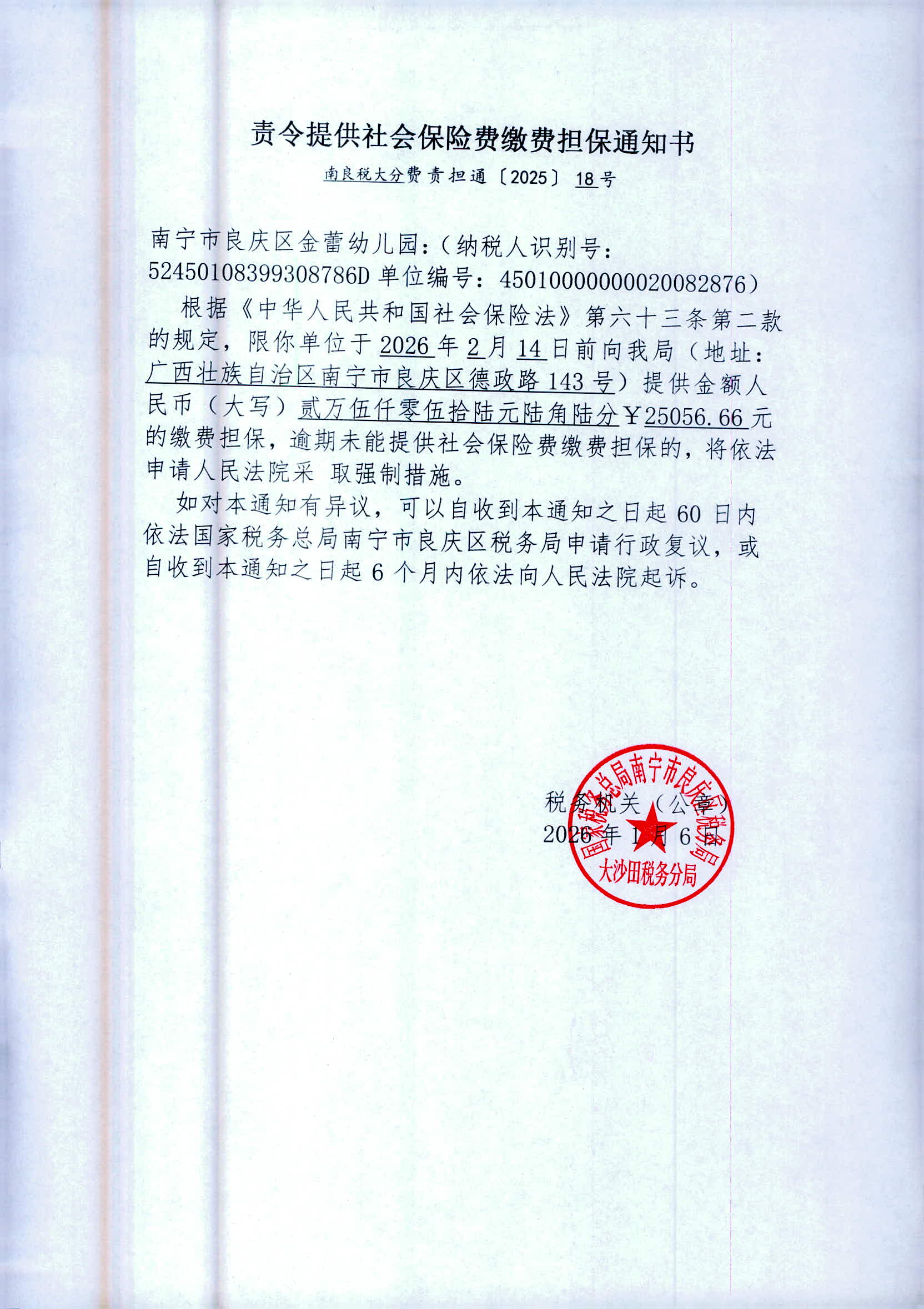 请你公司及时到我局大沙田税务分局签收《责令提供社会保险费缴费担保通知书》南良税大分费责担通〔2025〕18号、《责令提供社会保险费缴费担保通知书》南良税大分费责担通〔2025〕19号、《责令提供社会保险费缴费担保通知书》南良税大分费责担通〔2025〕20号,本公告自发布之日起满30日,上述《责令提供社会保险费缴费担保通知书》即视为送达。