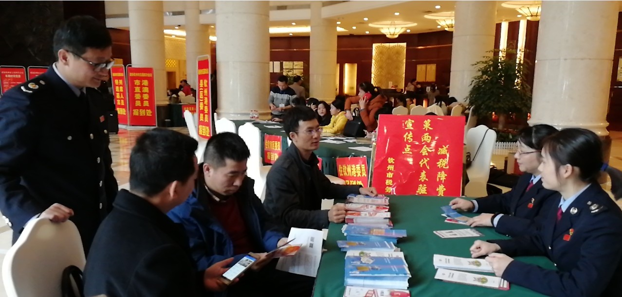 “前几天,市税务局的同志到市政协为我们宣讲最新优惠政策,覃永清局长给全市两会代表写了感谢信,还提前将装有税收优惠政策的资料袋送到每个代表的房间,今天又到代表报到现场为大家讲解政策、解答问题,你们的服务工作做得真是到家。”钦州市政协副秘书长刘如明对税务局同志的做法表示赞许。