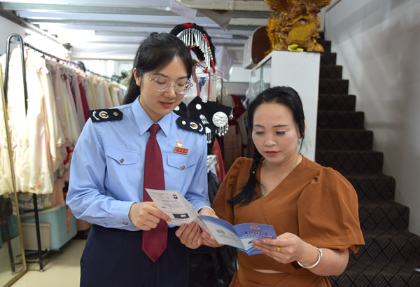 蒙山县税务局税务干部通过“政策找人”工作机制,主动上门为县内武侠服饰店等文旅企业提供涉税服务。孙莹莹摄