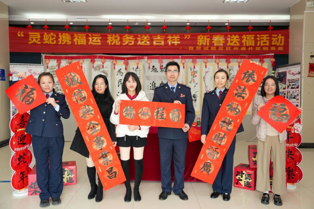 国家税务总局中国(广西)自由贸易试验区钦州港片区税务局举办了“灵蛇携福运 税务送吉祥”新春送福活动,“量身定制”专属春联,向纳税人送去新春祝福。