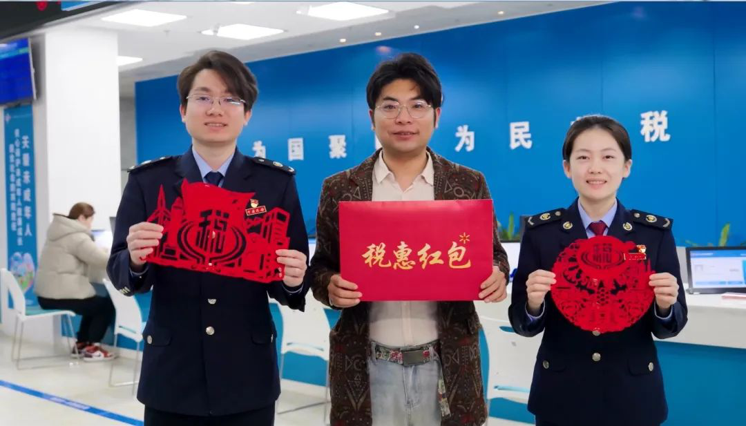 国家税务总局柳州市城中区税务局青年干部向来到办税大厅办理税费业务的纳税人送上税惠红包。