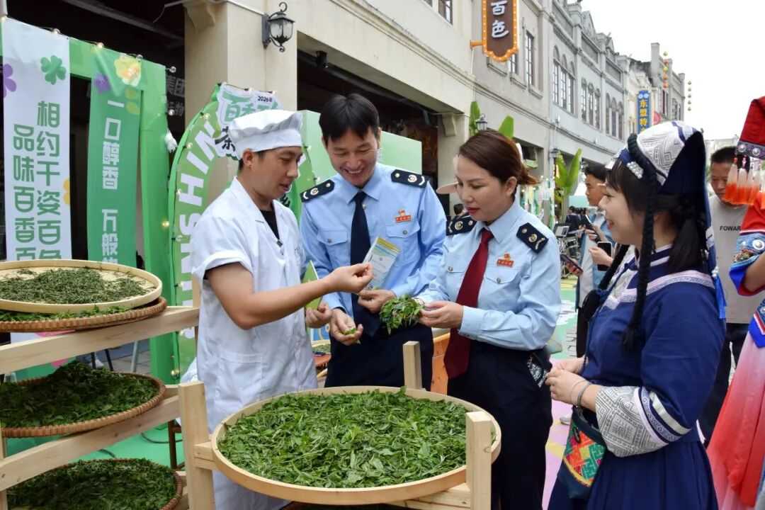 百色市税务局“右税劳模先锋队”赴“百色百香茶咖春饮季”活动现场,向茶叶商户讲解“数字农人”平台相关涉税要求,推动农业数字化规范发展,助力乡村消费潜力释放。(韦东玲 摄)